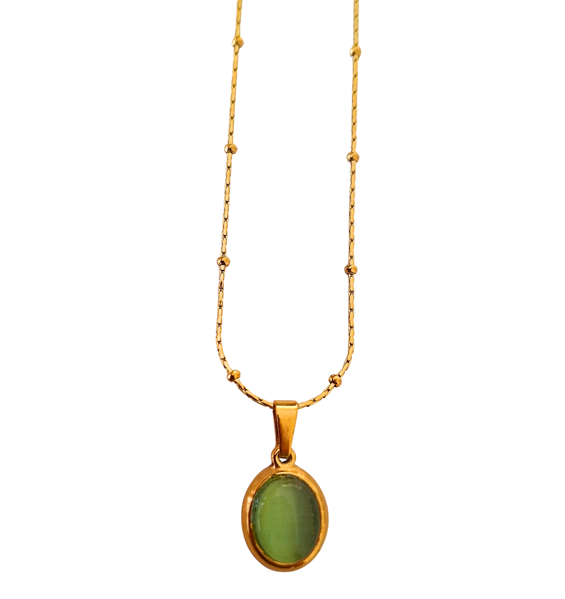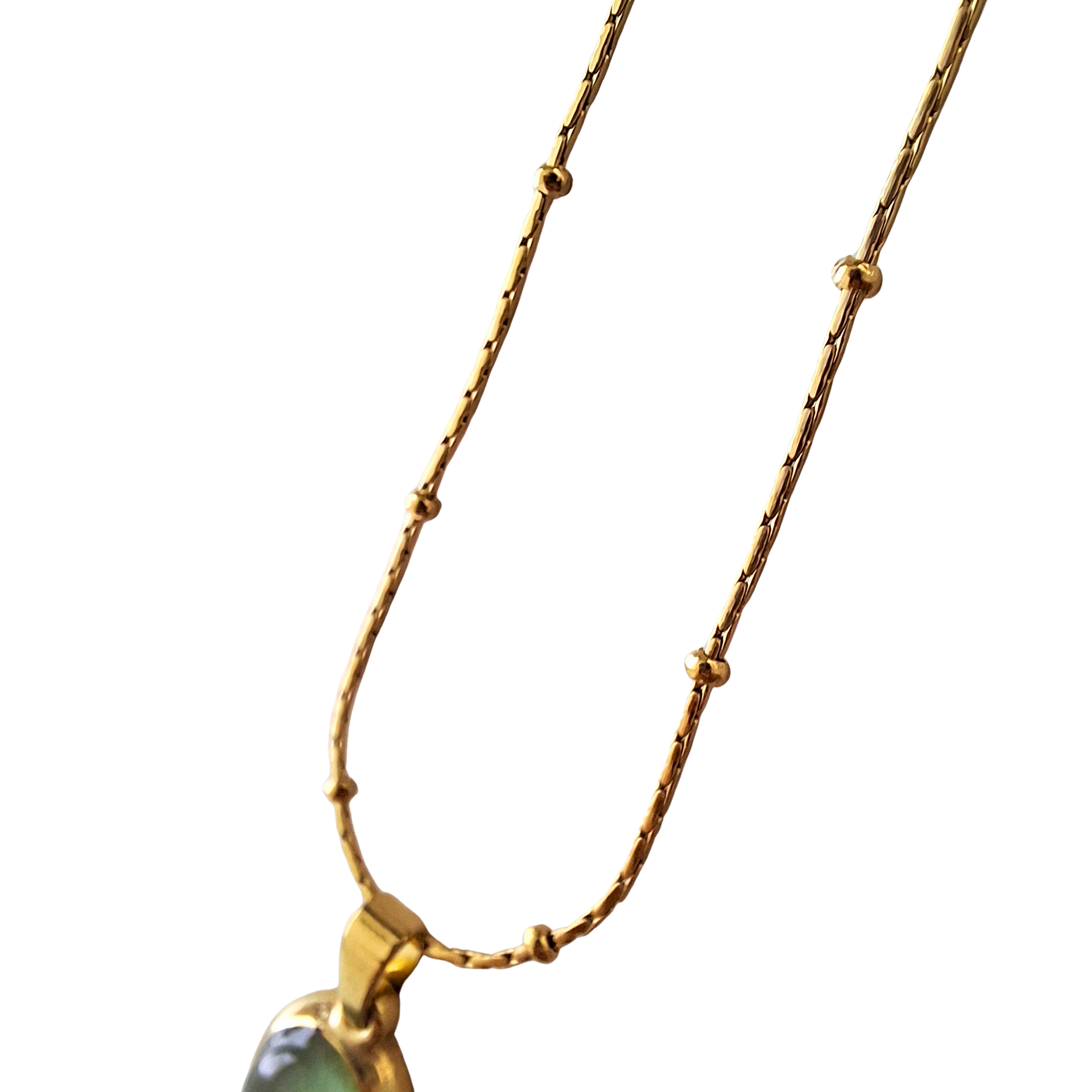 Este collar presenta una piedra de aguamarina verde, engarzada en un marco dorado sobre una cadena fina y elegante. Conocida como la piedra de los mares, la aguamarina verde simboliza la calma emocional, la autenticidad y la comunicación consciente.