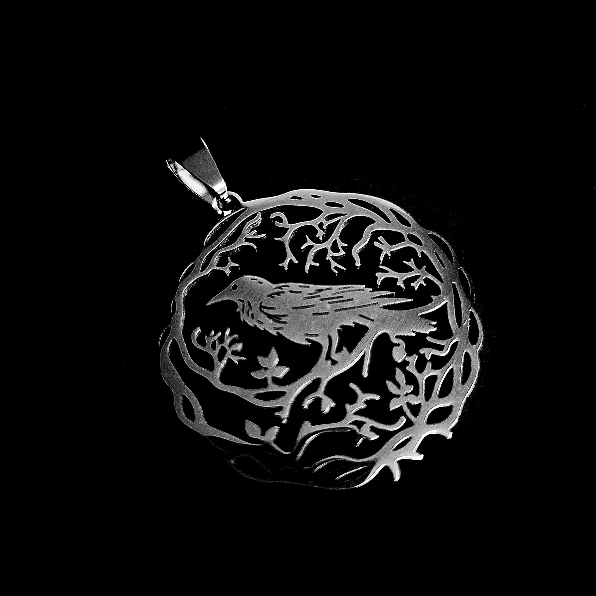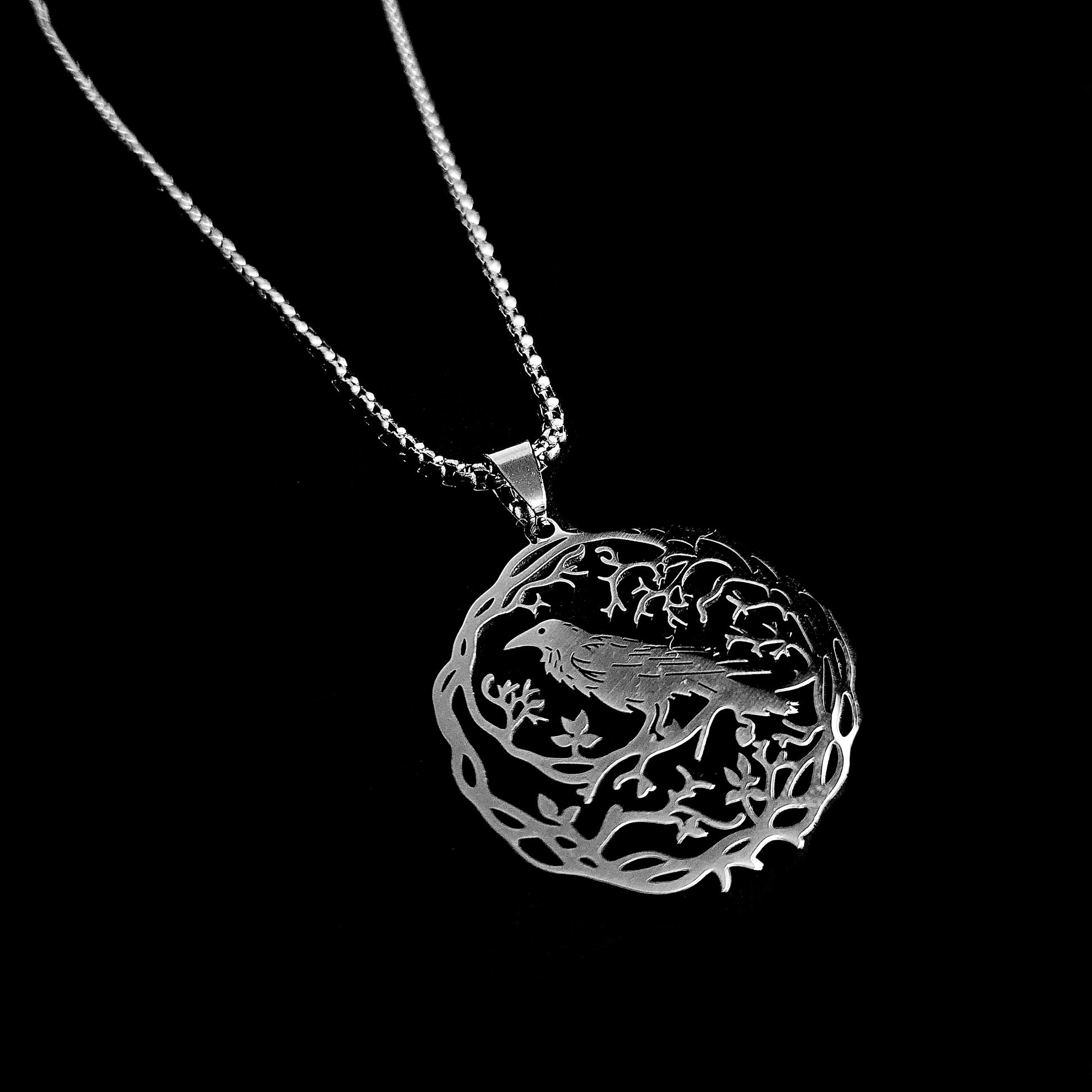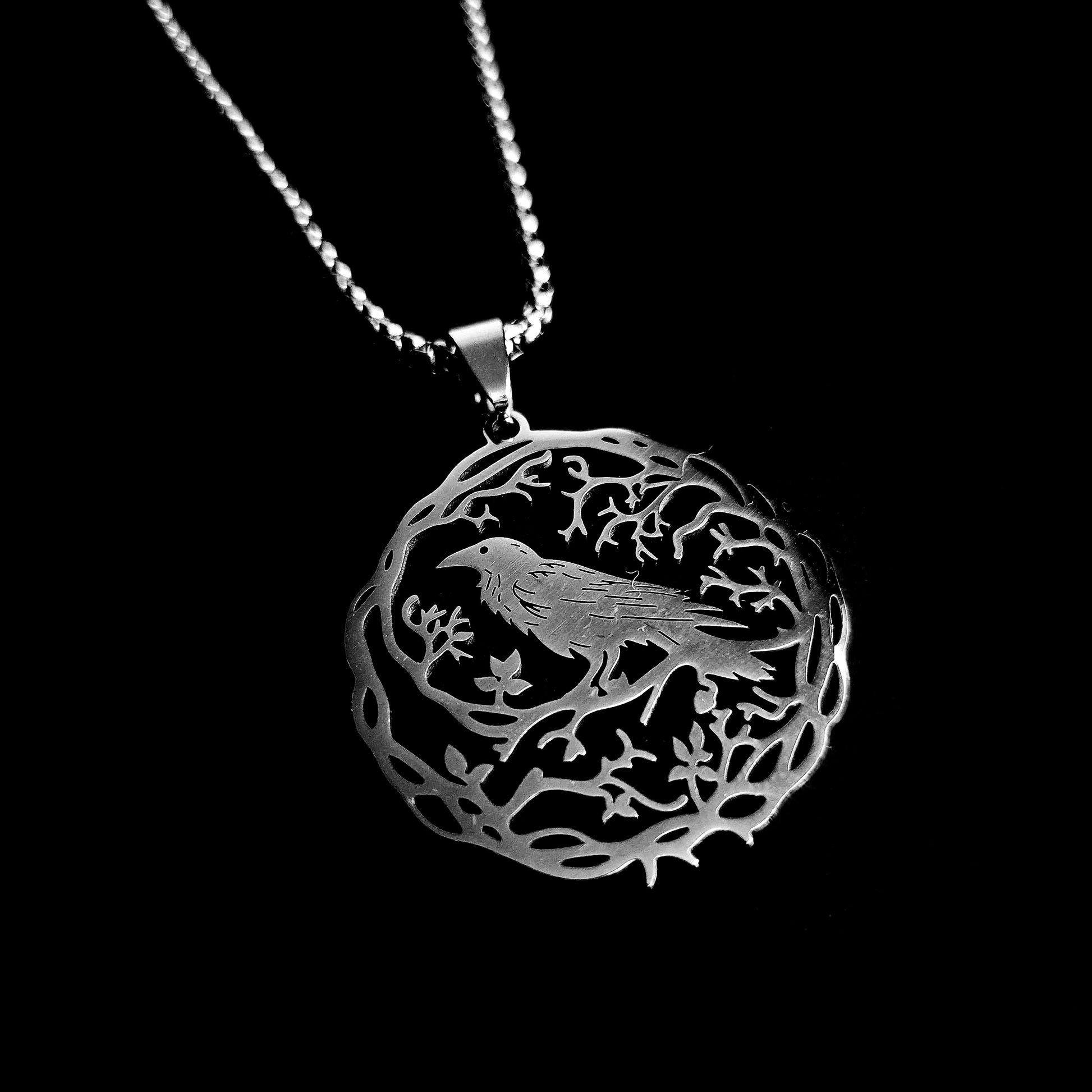 Este collar presenta la figura de un cuervo posado sobre una rama, enmarcado por un círculo de ramas entrelazadas. Hecho en acero inoxidable 316, es una joya resistente, con alma salvaje y espíritu libre.
