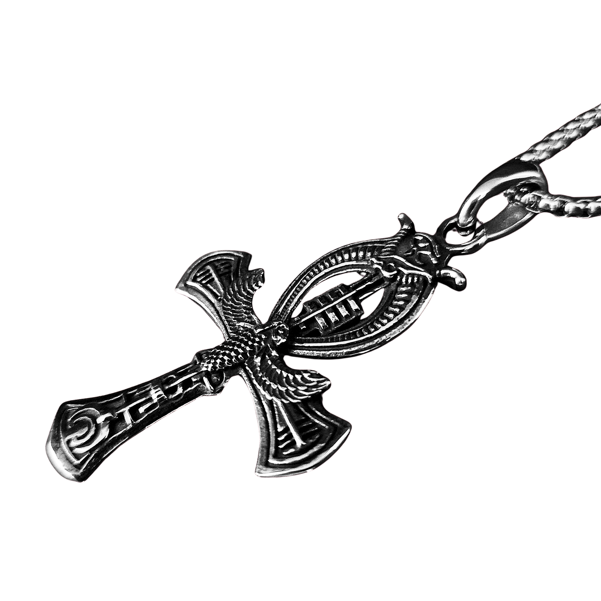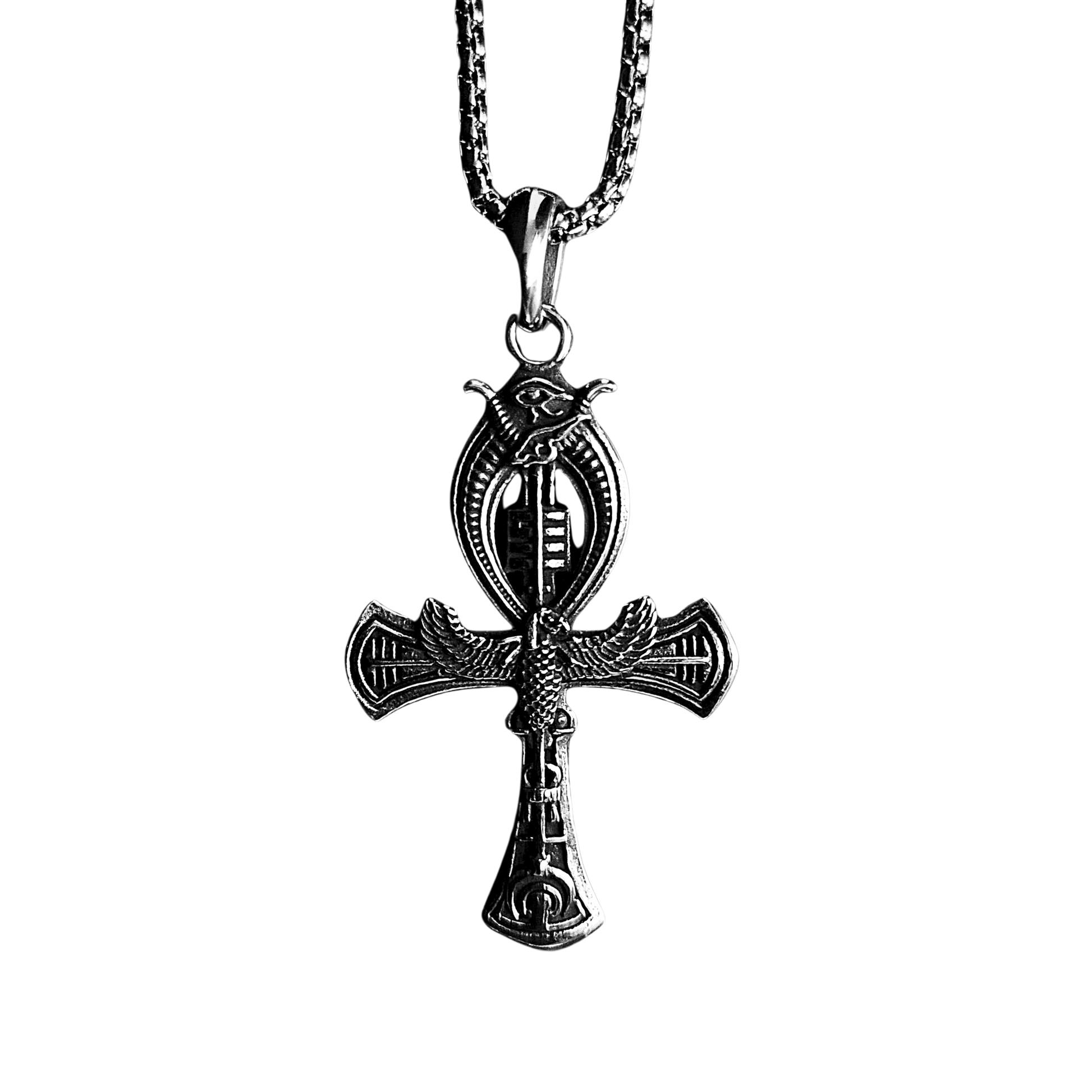 Este collar presenta una llave de Ankh de tamaño mediano/grande, colgando sobre una cadena de acero inoxidable 316. El Ankh, también conocido como cruz egipcia, es un antiguo amuleto de protección, asociado con la vida eterna, la regeneración y la conexión entre lo humano y lo divino.